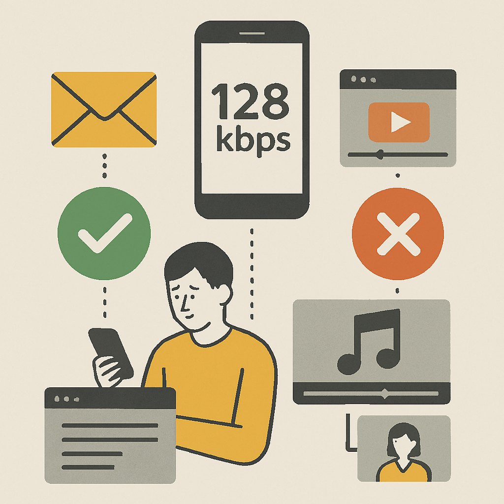 128kbpsは「最低限の通信ができる速度」です。画像や動画が多い現代のアプリでは、読み込みが追いつかない場面が増えます。特に混雑時間帯は体感速度がさらに落ちます。